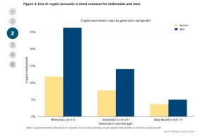 O relatório também avaliou se certos grupos demográficos são mais propensos a comprar criptomoedas. Ele descobriu que homens de todas as idades compram significativamente mais criptomoedas do que mulheres e que os mais jovens compram significativamente mais do que os mais velhos. Por exemplo, o relatório descobriu que mais de 25% dos homens da geração do millennium compraram criptomoedas, enquanto apenas cerca de 12% das mulheres da geração do millennium e 5% dos baby boomers do sexo masculino o fizeram.