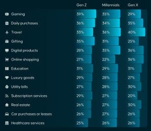 Por outro lado, a Geração X — aqueles nascidos entre meados da década de 1960 e o início da década de 1980 — tende a utilizar criptomoedas principalmente para compras de alto valor. Cerca de 40% dos participantes da Geração X afirmaram usar criptomoedas para pagar viagens, produtos digitais e até transações imobiliárias. Essa tendência sugere uma crescente confiança na segurança e na utilidade dos ativos digitais entre consumidores de meia-idade, que podem ter maior renda disponível e buscam diversificar seus instrumentos financeiros. Para esses usuários, as criptomoedas servem tanto como reserva de valor quanto como opção de pagamento conveniente para compras caras e, às vezes, internacionais.