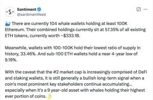 Os maiores detentores de Ethereum, ou “baleias”, atingiram um marco recorde, controlando coletivamente cerca de 57% de todo o Ether (ETH) em circulação, de acordo com a empresa de análise on-chain, Santiment.