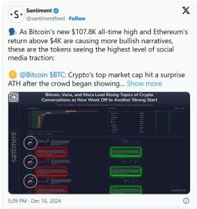 De acordo com a Santiment, o Bitcoin e algumas altcoins especiais continuam a envolver narrativas de negociação. Por exemplo, a Vanachains (VANA) atraiu interesse após sua introdução na Binance Launchpool e sua aplicação em acordos de custódia, e a Moca Networks (MOCA) aumentou 95% em preço após sua introdução em várias exchanges sul-coreanas altamente negociadas.