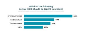 Ambos os grupos tinham uma visão ligeiramente diferente quando se tratava de blockchain, metaverso e NFTs, no entanto, com apenas cerca de 40% acreditando que esses assuntos também deveriam ser incluídos no currículo.