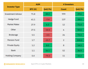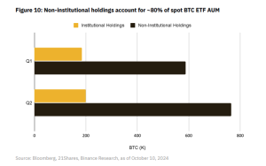 Em um relatório de pesquisa sobre ETFs de criptomoedas, analistas da Binance compartilharam que investidores não institucionais representavam quase 80% do total de ativos sob gestão (AUM) em ETFs BTC.