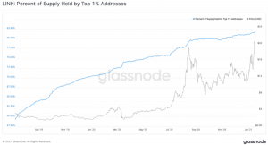 De acordo com o agregador de dados de mercado de criptomoedas, Glassnode, a distribuição de tokens do Chainlink (LINK) está em níveis recordes de centralização – com mais de 80% do LINK não mantido nas exchanges residindo atualmente no 1% superior das carteiras Chainlink.