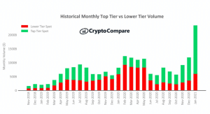 De acordo com um relatório da CryptoCompare Research, as exchanges que a empresa de análise classificou como “top tier” ganharam 13% da participação de mercado de outubro de 2020 a janeiro. Isso colocou a participação de mercado dessas 84 exchanges em cerca de 74%, com mais de US$1 trilhão em ativos.