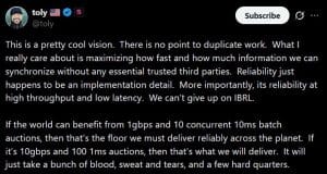 Anatoly Yakovenko, da SOLANA, oferece uma visão contrastante, onde a resiliência é inseparável do desempenho. Para Yakovenko, um blockchain que não consegue lidar com as demandas em tempo real do mundo moderno não é verdadeiramente resiliente, independentemente de sua pureza filosófica. Ele argumenta que a economia global exige um “relógio” sincronizado e de alta capacidade de processamento que possa gerenciar milhares de leilões e pagamentos simultâneos com latência de milissegundos. A confiabilidade é medida pela capacidade da rede de manter um estado consistente sob carga extrema.
