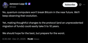 Recentemente, uma profunda cisão se formou na comunidade Bitcoin sobre o cronograma e a necessidade de uma reformulação pós-quântica. Enquanto desenvolvedores lendários como Jameson Lopp e Adam Back afirmam que uma ameaça funcional ainda está a décadas de distância, eles começaram a reconhecer um gargalo significativo: a “defasagem social e de governança”. Lopp alertou recentemente que, mesmo que o código estivesse pronto hoje, o processo de alcançar consenso, atualizar todos os nós e orquestrar uma migração voluntária de milhões de usuários levaria facilmente de cinco a dez anos. Jameson Lopp alertou recentemente que o processo de alcançar consenso e orquestrar uma migração voluntária levaria facilmente de cinco a dez anos.