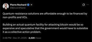 A confiança da comunidade técnica se baseia na imensa diferença física entre o hardware quântico atual e o que seria necessário para quebrar as assinaturas ECDSA do Bitcoin. Em dezembro de 2025, os sistemas mais avançados de empresas como IBM e GOOGLE possuíam aproximadamente de 100 a 1.000 qubits físicos, enquanto que para quebrar uma chave privada do Bitcoin, estima-se que seriam necessários de 13 milhões a 317 milhões de qubits físicos para executar o Algoritmo de Shor de forma eficaz. Os desenvolvedores argumentam que, como o Bitcoin não depende de criptografia — mas sim de assinaturas digitais e hashing —, ele não é tão vulnerável a ataques do tipo “coletar agora, descriptografar depois” quanto os bancos de dados centralizados usados por bancos e governos. Estima-se que seriam necessários de 13 milhões a 317 milhões de qubits físicos para quebrar uma chave privada do Bitcoin de forma eficaz.