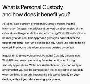 No entanto, da perspectiva da Worldcoin, o processo é projetado com a privacidade do usuário em mente. Um representante disse que as imagens da íris capturadas pelo Orb são criptografadas e transmitidas diretamente para o telefone do usuário, sendo posteriormente excluídas do dispositivo. O próprio código da íris é anonimizado usando técnicas de MPC, o que significa que nenhuma informação pessoalmente identificável é armazenada centralmente. Além disso, o aplicativo World não possui custódia, permitindo que os usuários mantenham o controle sobre seus ativos digitais e World IDs.