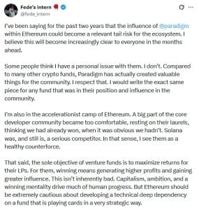 Em uma publicação recente nas redes sociais, Carrone, que usa o pseudônimo Fede’s intern, fez questão de reconhecer que a PARADIGM “criou coisas valiosas para a comunidade”.
