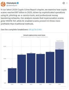 O cenário dos ativos digitais está testemunhando uma sofisticada “industrialização da fraude”, onde a linha entre serviços legítimos e atividades criminosas se tornou perigosamente tênue. De acordo com o Relatório de Golpes com Criptomoedas de 2026 da CHAINALYSIS, os golpes de falsificação de identidade explodiram em 2025, registrando um aumento impressionante de 1.400% em relação ao ano anterior. Esse aumento marca uma mudança fundamental na forma como os criminosos operam; eles não são mais apenas indivíduos enviando e-mails de phishing desajeitados. Em vez disso, eles se organizaram em redes modulares baseadas em serviços.