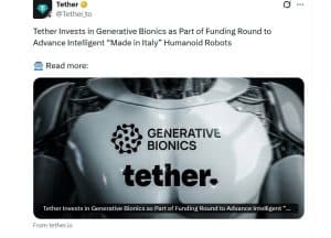 Em meados de novembro, também surgiram relatos de que a TETHER estava considerando um investimento maciço de US$ 1,15 bilhão em outra empresa europeia de robótica, a NEURA ROBOTICS, embora esse acordo não tenha sido oficialmente confirmado. Em meados de novembro, também surgiram relatos de que a TETHER estava considerando um investimento maciço de US$ 1,15 bilhão em outra empresa europeia de robótica, a NEURA ROBOTICS, embora esse acordo não tenha sido oficialmente confirmado.
