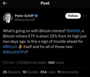 O proponente do ouro e cético em relação às criptomoedas, Peter Schiff, foi um dos que notou a tendência no X, ponderando se a queda nas ações de mineração do Bitcoin era um sinal de problemas futuros para o Bitcoin.