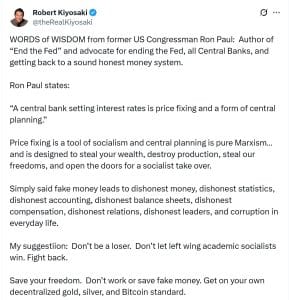 A crítica de Kiyosaki centra-se na ideia de que os bancos centrais, ao manipular as taxas de juros e controlar a oferta de moeda, se envolvem no que ele descreve como “fixação de preços”. Esse sentimento ecoa as opiniões de Ron Paul, um crítico de longa data do Fed, que argumenta que tais práticas minam a liberdade econômica e corroem o patrimônio pessoal. Kiyosaki afirma: