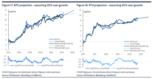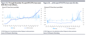 Os fundos negociados em bolsa (ETFs) se tornaram um meio popular de fazer investimentos e os investidores podem comprar exposição a criptomoedas sem realmente possuir os ativos. O Citi destaca que as entradas para ETFs de criptomoedas são um indicador importante, pois podem ser frequentemente consideradas como capital novo entrando na indústria, ou seja, em 2024, as entradas de ETFs de Bitcoin foram responsáveis por aproximadamente 46% da variação na ação do preço do Bitcoin, com cada US$1 bilhão de entradas correlacionadas a um retorno aproximado de 4,7%.