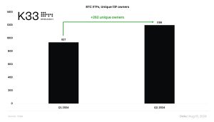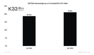 A adoção institucional de ETFs de Bitcoin (BTC) spot baseados nos Estados Unidos cresceu mais de 27% durante o segundo trimestre de 2024.