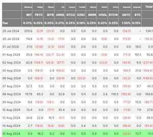 Contribuindo para a queda de preço, as entradas de ETF de Bitcoin continuam estagnadas. Os fluxos de entrada de ETFs ficaram positivos em meados de agosto, com mais de US$11 milhões em fluxos de entrada, de acordo com dados da Farside Investors.