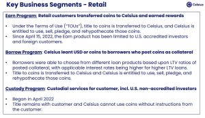Na primeira audiência de falência da Celsius, os advogados do escritório de advocacia Kirkland liderados por Pat Nash, detalharam como os usuários de varejo com contas Earn and Borrow transferiram o título de suas moedas para a empresa de acordo com seus termos de serviço (ToS). Como resultado, Celsius é livre para “usar, vender, prometer e re-hipotecar essas moedas” como desejar.