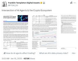 A inteligência artificial (IA) está ganhando um impulso significativo no universo das criptomoedas, impulsionando uma onda de tokens habilitados por essa tecnologia. Um relatório da Franklin Templeton, divulgado em 14 de janeiro, prevê que agentes de IA desempenharão um papel transformador na geração de conteúdo em plataformas de mídia social e se tornarão essenciais em uma variedade de setores. Essa previsão audaciosa alimentou a alegria do mercado, com tokens de IA, como Virtuals Protocol (VIRTUAL), ai16z (AI16Z) e assim por diante, ganhando movimentos de preço extraordinários nos poucos dias após o lançamento.