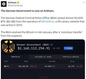 De acordo com dados de Arkham, a carteira criptográfica manteve quase 50.000 Bitcoin (BTC) desde fevereiro de 2024, antes de movimentar quase 6.500 BTC em junho. Acredita-se que os fundos tenham sido apreendidos do operador do site de filmes piratas, Movie2k.