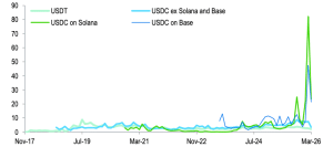 Segundo Geoff Kendrick, chefe de pesquisa em cripto do banco, o impacto dessa mudança é direto. Se a velocidade permanecer constante, o aumento nas transações exigirá maior emissão de stablecoins. Mas, com a aceleração observada, essa relação deixa de ser linear. O crescimento do mercado pode se desacoplar da expansão da oferta.