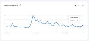 De fato, embora tenha havido um modesto aumento de 8% nas buscas durante a semana de 6 a 12 de julho, esse número permanece significativamente menor — cerca de 60% — em comparação com o período após a vitória de Donald Trump nas eleições presidenciais de 2024 nos EUA. Aquela semana eleitoral marcou um aumento no interesse do varejo que precedeu a alta inicial do Bitcoin acima de US$100.000 em dezembro de 2024.