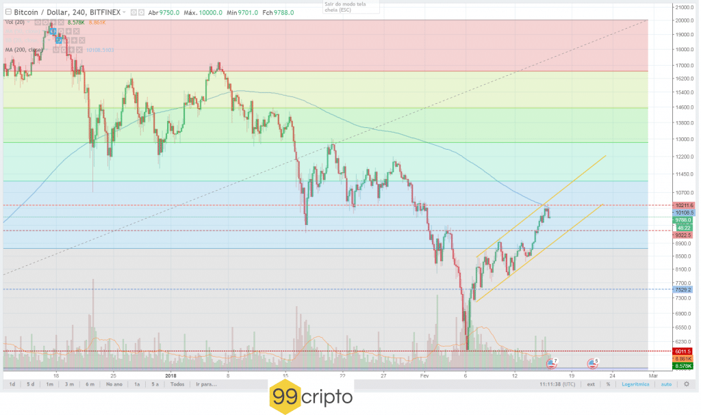 Outra boa notícia é que o BTC chegou a tocar na média móvel 200 períodos (4 horas), algo que não ocorria a um bom tempo. E vinha se mantendo bem distante desta linha de tendência. A barreira dos 10k, caso seja rompida, irá trazer bons ventos para os investidores. Pois começa a aparecer faixas seguras indicando que o mercado está começando a se inverter.