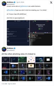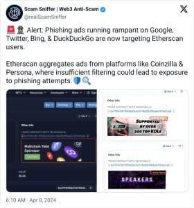 Seguindo o exemplo de McBiblets, a plataforma anti-scam Web3, Scam Sniffer, descobriu que os anúncios de phishing se espalhavam além do Etherscan e estavam aparecendo em mecanismos de busca populares como Google, Bing, DuckDuckGo, bem como na plataforma de mídia social, X.