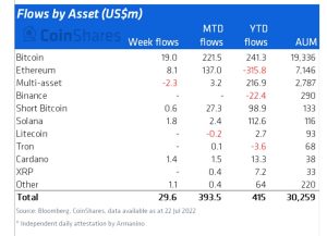 Notavelmente, embora os investidores institucionais tenham sido cautelosos com o ETH durante a maior parte de 2022, essa visão sobre o BTC permaneceu relativamente positiva na maior parte – exceto alguns obstáculos no caminho – com produtos BTC gerando US$241,3 milhões em entradas no acumulado do ano.