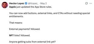 “Os desenvolvedores agora poderiam se vincular a sistemas de pagamento externos sem a necessidade de um direito, facilitando a operação de aplicativos baseados em criptomoedas em um ambiente mais descentralizado e aberto.”