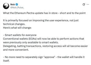 Yehor Rudytsia, pesquisador on-chain da Hacken, destacou que a atualização efetivamente transforma EOAs em contratos inteligentes programáveis por meio desse novo tipo de transação. Anteriormente, os EOAs eram estáticos e exigiam transações on-chain assinadas pelo usuário para qualquer movimentação de fundos. Após o Pectra, as assinaturas de delegação off-chain podem garantir controle operacional total.