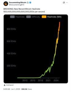 A taxa de hash da rede Bitcoin, uma medida do poder computacional total dedicado à mineração e verificação de transações, atingiu novos patamares em maio de 2025. Dados do Blockchain.com revelam que a taxa de hash da rede atingiu o pico em torno de 942 exahashes por segundo (EH/s) em 31 de maio.