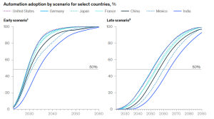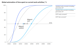 A McKinsey explicou que seu amplo intervalo de 2030-2060 foi feito para abranger uma série de resultados – como a taxa na qual a IA generativa é adotada, decisões de investimento e regulamentação, entre outros fatores.