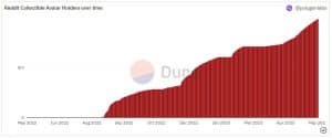 De acordo com o Dune Analytics, há atualmente um total de 9.909.465 milhões de detentores de avatares colecionáveis no Reddit. Cerca de 7,7 milhões deles são identificados como detentores de avatares coletivos únicos ou que não possuem carteiras múltiplas.