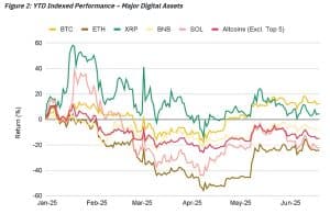 (BTC, ETH, XRP, BNB, SOL, gráfico acumulado no ano.)