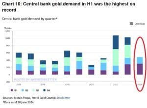 Em uma postagem, o outlet de macroeconomia, o Kobeissi Letter relatou que as compras líquidas globais de ouro pelos bancos centrais atingiram 483 toneladas no primeiro semestre de 2024, o maior número já registrado.