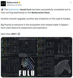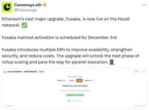 A rede Ethereum acaba de concluir com sucesso o último ensaio geral para sua próxima grande atualização, um marco crucial que mantém a maior plataforma de contratos inteligentes do mundo no caminho certo para seu ambicioso lançamento na rede principal em 3 de dezembro. A atualização, codinome Fusaka, foi implementada na rede de testes Hoodi, a última de suas três redes de teste, após implementações bem-sucedidas em Holesky e Sepolia. As equipes de clientes validadores, como a NETHERMIND, relataram rapidamente uma “atualização tranquila”, sinalizando que o novo código está estável e pronto para seu lançamento oficial.