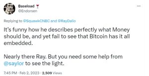 Os Bitcoiners foram rápidos em responder à entrevista, comentando que o Bitcoin já se encaixa na descrição de Dalio de como o dinheiro deveria ser. Um membro da comunidade twittou: