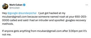 O investidor bilionário, Mark Cuban, afirma que perdeu o acesso à sua conta do Gmail depois de ser vítima de uma chamada falsa, poucos meses depois de mais de US$800.000 terem sido drenados de sua carteira de criptomoedas.