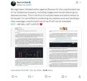 Em uma carta de cessação e desistência, Mark Longo, o fundador e proprietário do “Peanut the Squirrel”, notificou a Binance, acusando a exchange de criptomoedas de utilizar as marcas registradas e o mascote para comercializar a moeda meme baseada em PNUT sem permissão. Longo afirma que a Binance violou sua propriedade intelectual ao licenciar a marca registrada e o mascote “Peanut the Squirrel”, que ele vem promovendo por razões de bem-estar animal e educação desde 2017.
