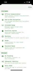 No lançamento, o Bitchat suporta mensagens privadas individuais e conversas em grupo com base em nomes de salas marcadas com hashtags. Senhas opcionais adicionam outra camada de segurança. As mensagens são criptografadas com base no tipo — privada, baseada em sala ou transmissão — e, reconhecendo as limitações do BLE, são divididas em blocos de 500 bytes para transmissão.