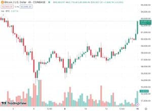 O Bitcoin (BTC) subiu 5,2%, recuperando-se das mínimas de dois meses de US$53.500 no início de julho, e atualmente está sendo negociado por US$59.145, de acordo com dados do TradingView.