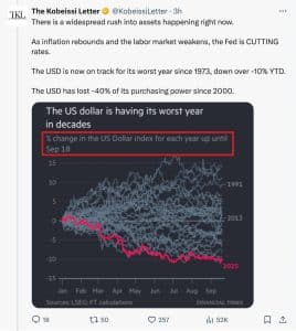 O catalisador para essa fuga generalizada para ativos tangíveis e digitais é a erosão abrupta do valor do dólar. O dólar americano está a caminho de seu pior desempenho anual desde 1973, tendo perdido mais de 10% de seu valor no acumulado do ano. Este não é um fenômeno recente, mas sim a aceleração de uma tendência de longo prazo; desde o ano 2000, o dólar americano perdeu aproximadamente 40% de seu poder de compra doméstico. O atual cenário econômico só agrava a situação. À medida que as pressões inflacionárias ressurgem e os principais indicadores do mercado de trabalho mostram sinais de fraqueza significativa, o Federal Reserve (Fed) se encontra em uma posição difícil, compelido a cortar as taxas de juros para estimular uma economia em crise.