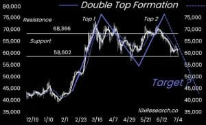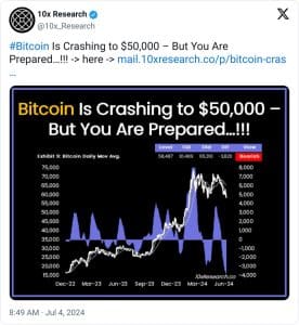 De acordo com especialistas da 10x Research, o Bitcoin está prestes a cair para menos de US$57.000, estando agora em mais de US$60.000. Eles sugerem que esse declínio acentuado pode estar apenas começando, potencialmente caindo ainda mais para US$50.000.