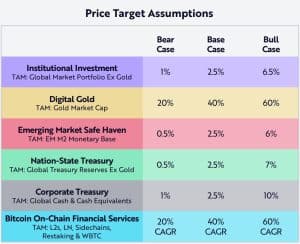 De acordo com a empresa, são três possíveis metas de preço para o Bitcoin até 2030, com base em diferentes suposições de taxa de crescimento: