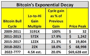 O veterano trader e analista Peter Brandt publicou uma teoria sugerindo que os ciclos de alta do mercado do Bitcoin exibiram um padrão de decadência exponencial.