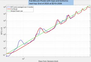 A análise combina a tendência da lei de potência, ciclos de halving de 4 anos, alturas de pico em declínio exponencial e outros fatores em um modelo integrado para previsões de preços do Bitcoin.
