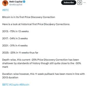 De acordo com o analista de criptomoedas Rekt Capital, a correção em andamento do Bitcoin é relativamente branda em comparação com as correções de descoberta de preços anteriores. O analista observa que, embora a queda atual de 25% seja significativa, ela ainda é um tanto superficial para os padrões históricos, que normalmente veem um declínio próximo a 30%. A correção atual, que durou cerca de 11 semanas, está mais alinhada com a duração do recuo do Bitcoin em 2013, sugerindo que o Bitcoin pode experimentar mais duas semanas de pressão negativa antes de se estabilizar.