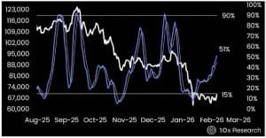 Em atualização divulgada na terça-feira, a 10x Research afirmou que o Bitcoin não conseguiu acelerar novas quedas mesmo diante de manchetes negativas no cenário macroeconômico, o que pode indicar perda de momentum vendedor.