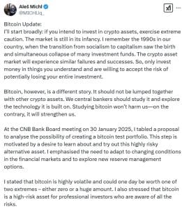O apelo de Michl para uma exploração mais profunda do Bitcoin vem depois que ele propôs um “portfólio de teste” para o CNB, sugerindo que o banco central deveria considerar investir em Bitcoin para entender melhor o potencial do ativo. Esta proposta foi feita durante uma reunião do conselho, onde Michl expressou interesse em experimentar o Bitcoin, que ele descreveu como um “ativo alternativo altamente arriscado”. A iniciativa ainda estava nos estágios iniciais, e qualquer decisão final seria baseada no resultado de uma análise mais aprofundada.