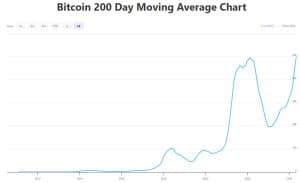 A média móvel simples de 200 dias (SMA) soma os últimos 200 dias do preço de fechamento do Bitcoin e o divide por 200 para resolver as flutuações de preços de curto prazo, com o objetivo de mostrar aos traders e analistas um indicador de tendência de longo prazo.